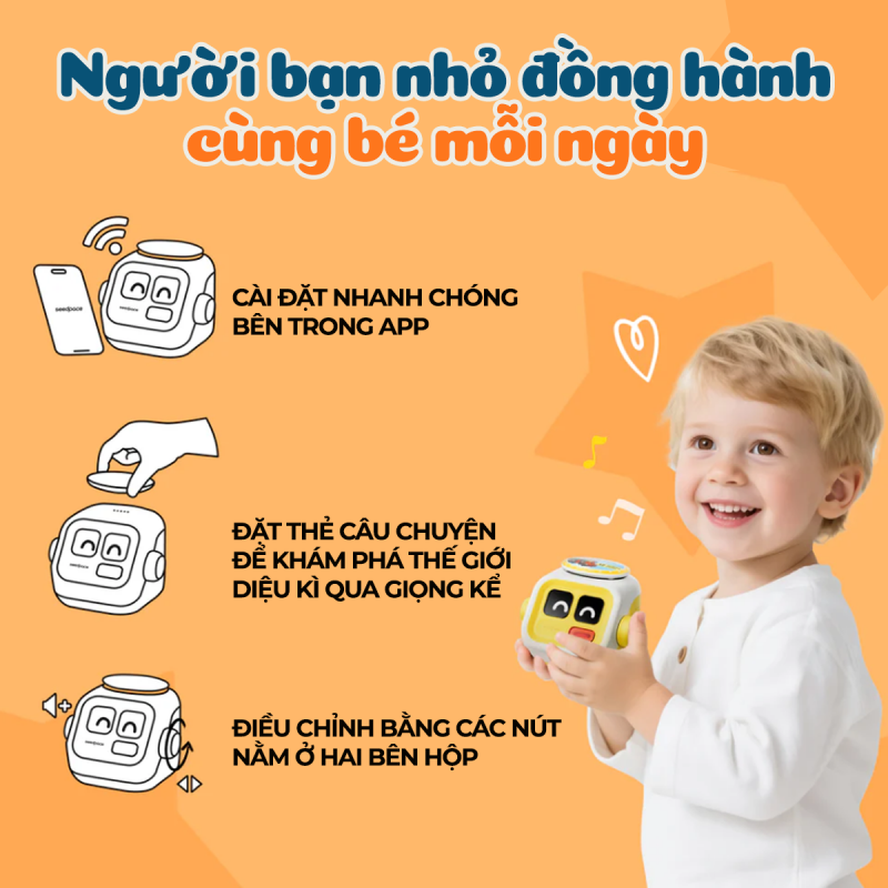 Seedpace là một thiết bị chơi game lành mạnh dành cho trẻ em, chỉ với các nút tương tác đơn giản mà không cần màn hình. Máy kể chuyện giúp thay đổi cách kể chuyện truyền thống. Trẻ em không chỉ nghe kể chuyện mà còn hóa thân thành nhân vật chính trong cuộc phiêu lưu của chính mình - khơi dậy sự sáng tạo, trí tưởng tượng và khả năng tập trung trong suốt hành trình khám phá.